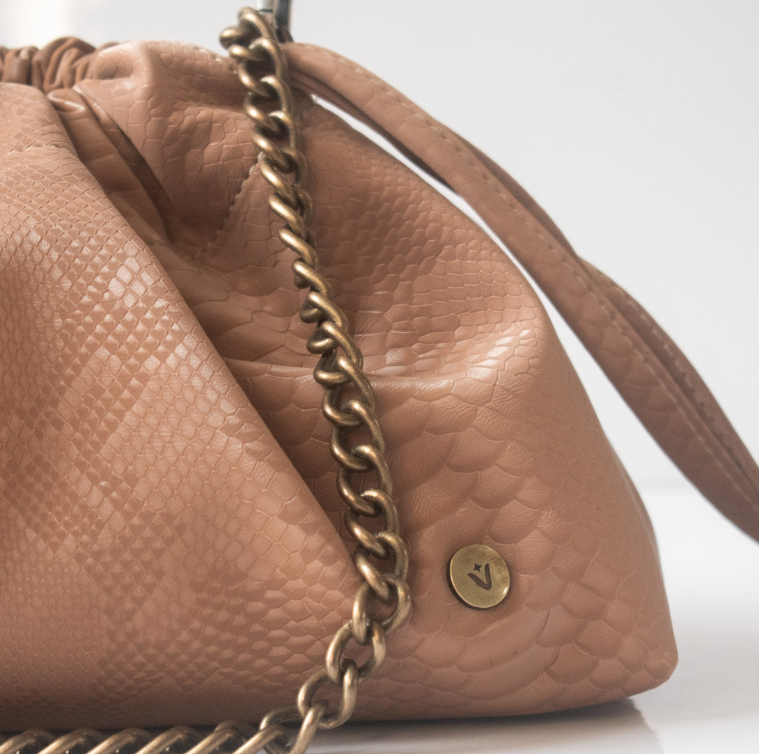 Ligera y amplia, la Nébula se transforma según tus necesidades: úsala como manos libres para mayor comodidad o llévala como cartera gracias a sus cargaderas removibles. Cada detalle está pensado para enamorar, desde su cadena decorativa que aporta brillo sutil hasta su bolsillo interno en textura de pitón mocca, una tendencia clave que suma carácter y modernidad.