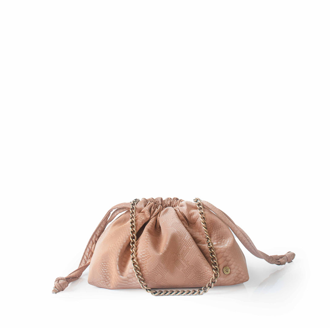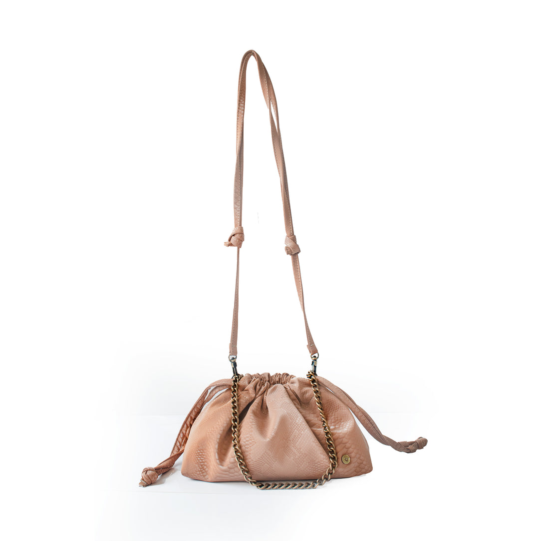 Su sistema de cierre tipo frunce es tan práctico como encantador: al halar las cargaderas laterales, el bolso se recoge, protegiendo tus pertenencias y creando una silueta única que marca diferencia.