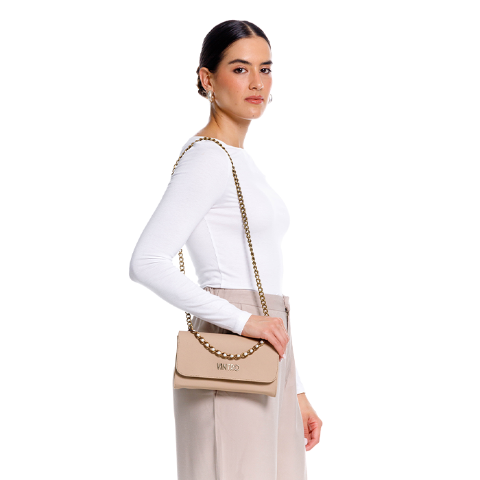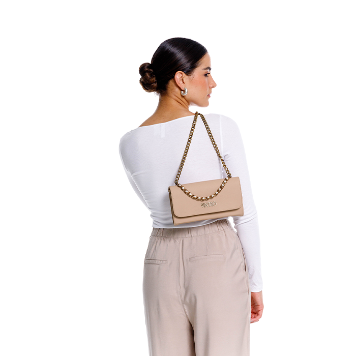 Manos libres pequeño Romantic. Un bolso que captura la esencia de la feminidad y el encanto de las perlas. Su diseño es ideal para llevar lo esencial con estilo, con un cierre de broche imán y una cargadera en cadena que le aporta un toque de sofisticación. En la parte posterior, una delicada cadena con perlas añade un detalle único y elegante.