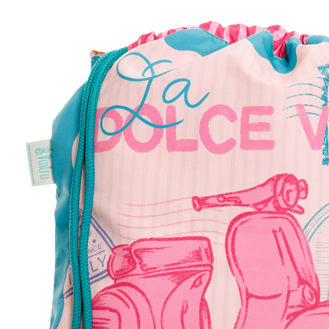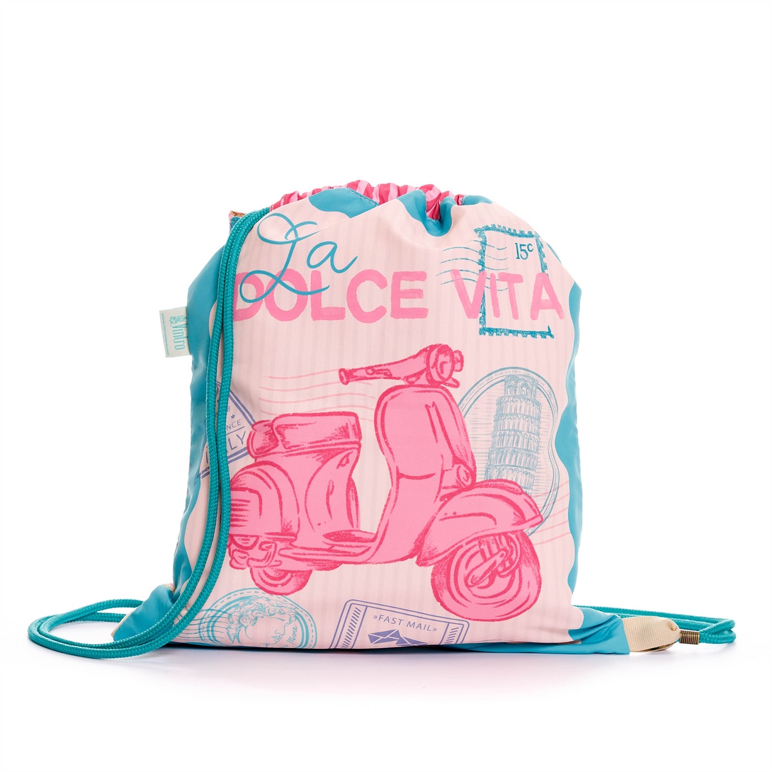 Tula en tela con estampado en la parte frontal y posterior en la colección Italia. Cargaderas gruesas y resistentes. Interior en tela antifluido. Bolsillo en la parte interna ideal para guardar tu celular o las llaves.